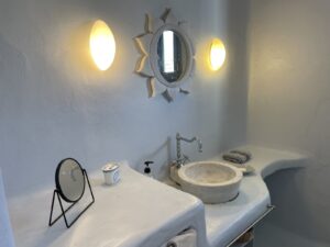 Designed to complement the natural beauty of its surroundings, Tinos Nightsky Villa features earthy tones and organic materials that evoke a sense of calm. Soft hues inspired by the island’s landscape adorn the walls, while large windows invite streams of natural light, creating a bright and airy atmosphere. Plush furnishings and thoughtfully curated decor ensure a luxurious yet inviting ambiance.🌅 Outdoor Bliss